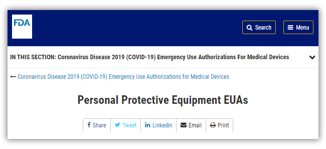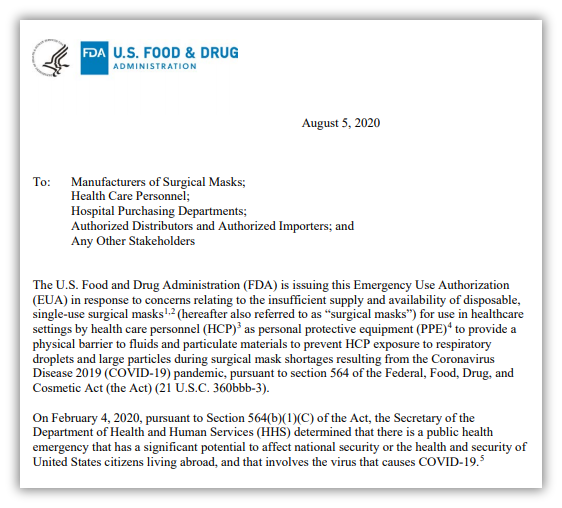 FDA缩小之前EUA申请适用范围,EUA(即Emergency Use Authorization,紧急使用授权)为美国政府为缓解COVID-19新冠肺炎造成的外科口罩短缺而设立的绿色审批路径。
