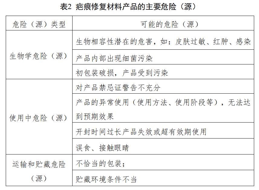 疤痕修复材料产品应按照YY/T 0316《医疗器械 风险管理对医疗器械的应用》进行风险分析。风险管理活动贯穿产品整个生命周期,企业应建立、形成相关文件(包括风险分析、风险评价、风险控制、生产和生产后信息)并保持一个持续的过程,用于识别与危险(源),估计和评价相关的风险,控制这些风险。在进行风险分析时至少应包括以下的主要危害,企业还应根据自身产品特点确定其他危害(见表2)。