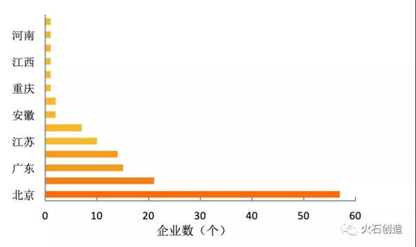 目前国内可统计的医疗AI产业公司有144个,并以京、沪浙苏、广东的医学AI产业为主,形成鼎足之势。四川、安徽、重庆、河南、福建、江西和湖北等地也开始布局医疗AI产业。见图2。